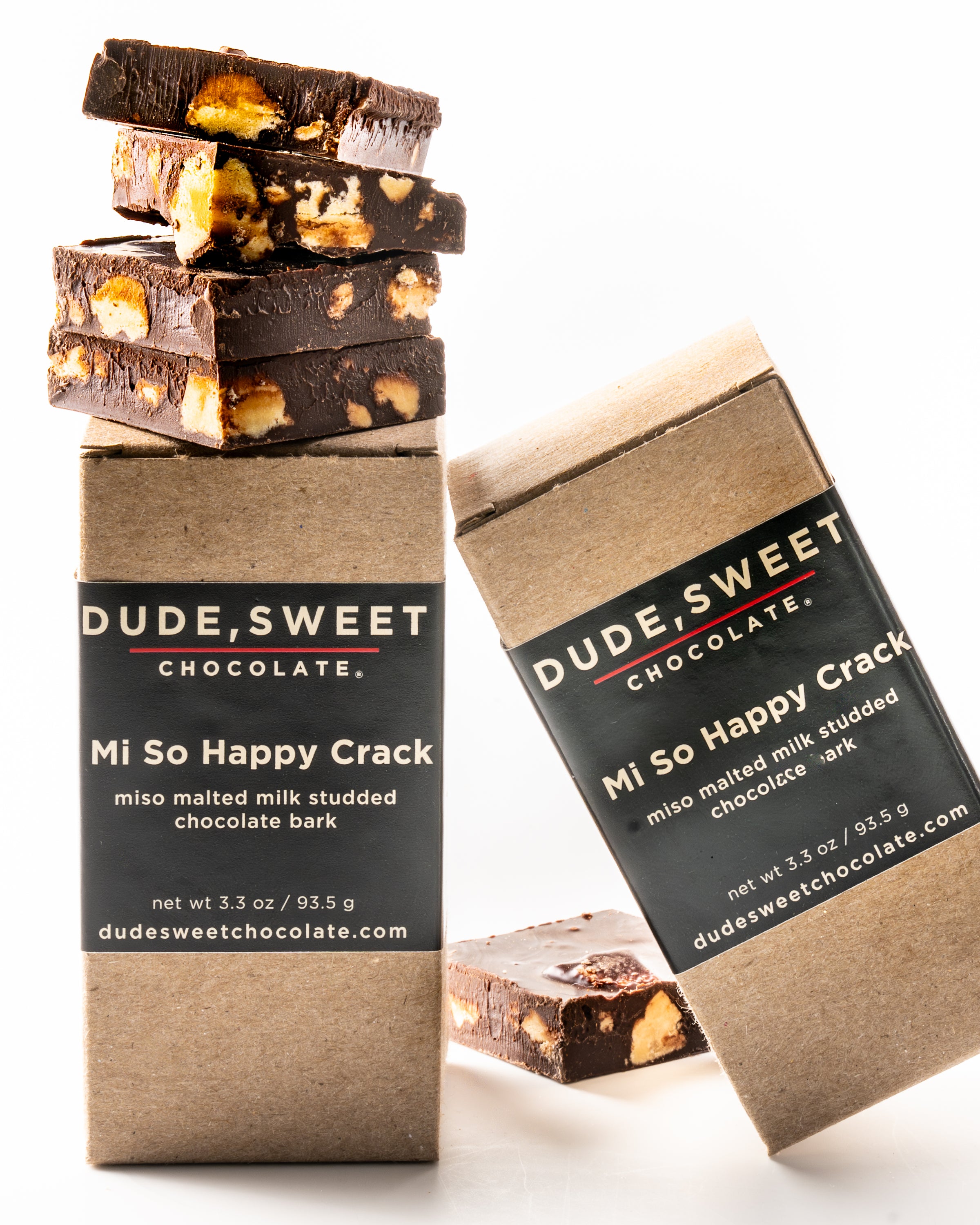 Our amazing South American dark chocolate bark made even better by putting in house made malted milk cubes with a touch of miso for salt