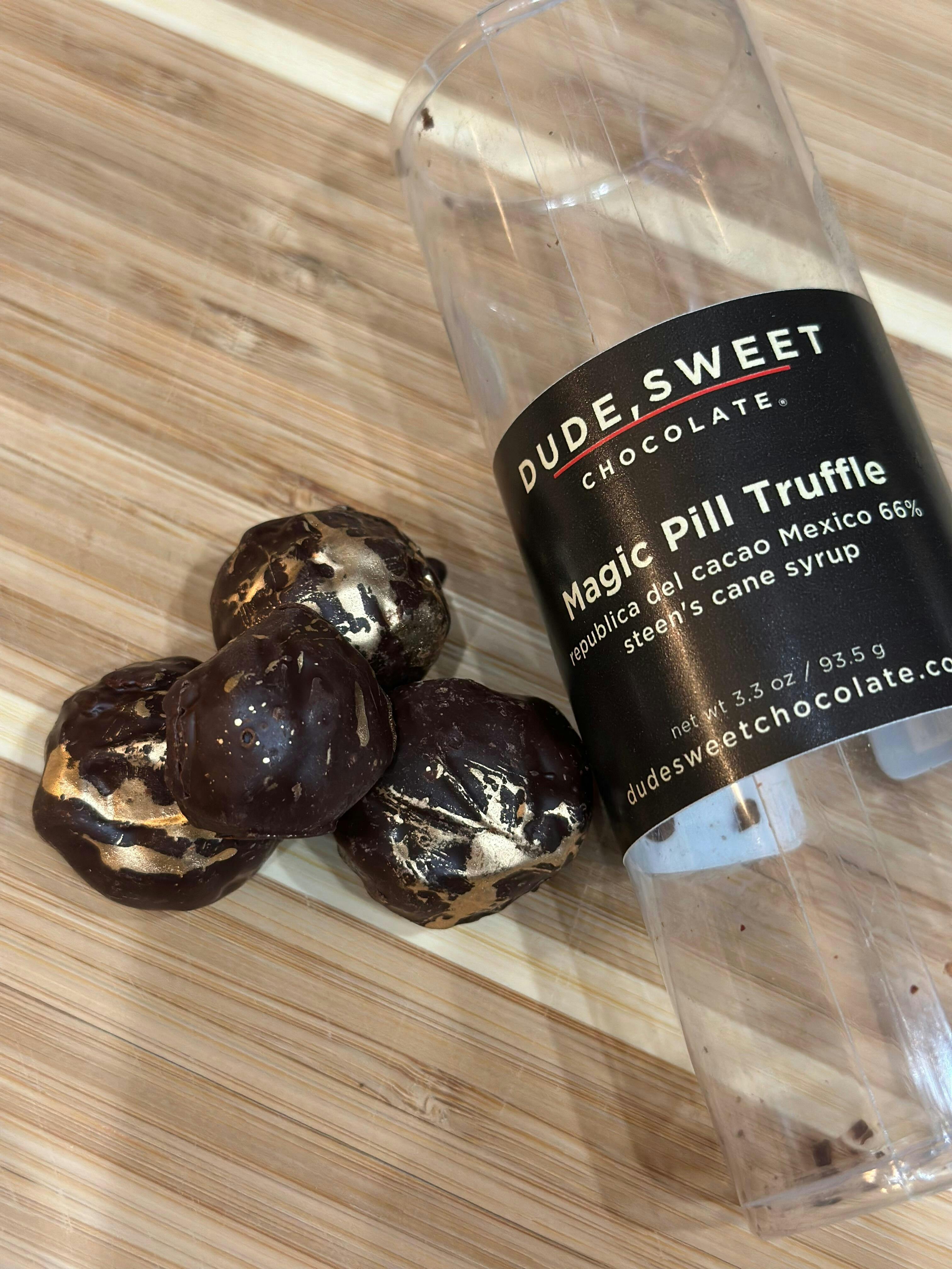 Our first ever dark chocolate truffle that has no other personalities, just the very best chocolate.  I used Republica del Cacao 66% from Mexico with amazing butter and Steen's cane syrup from Louisiana